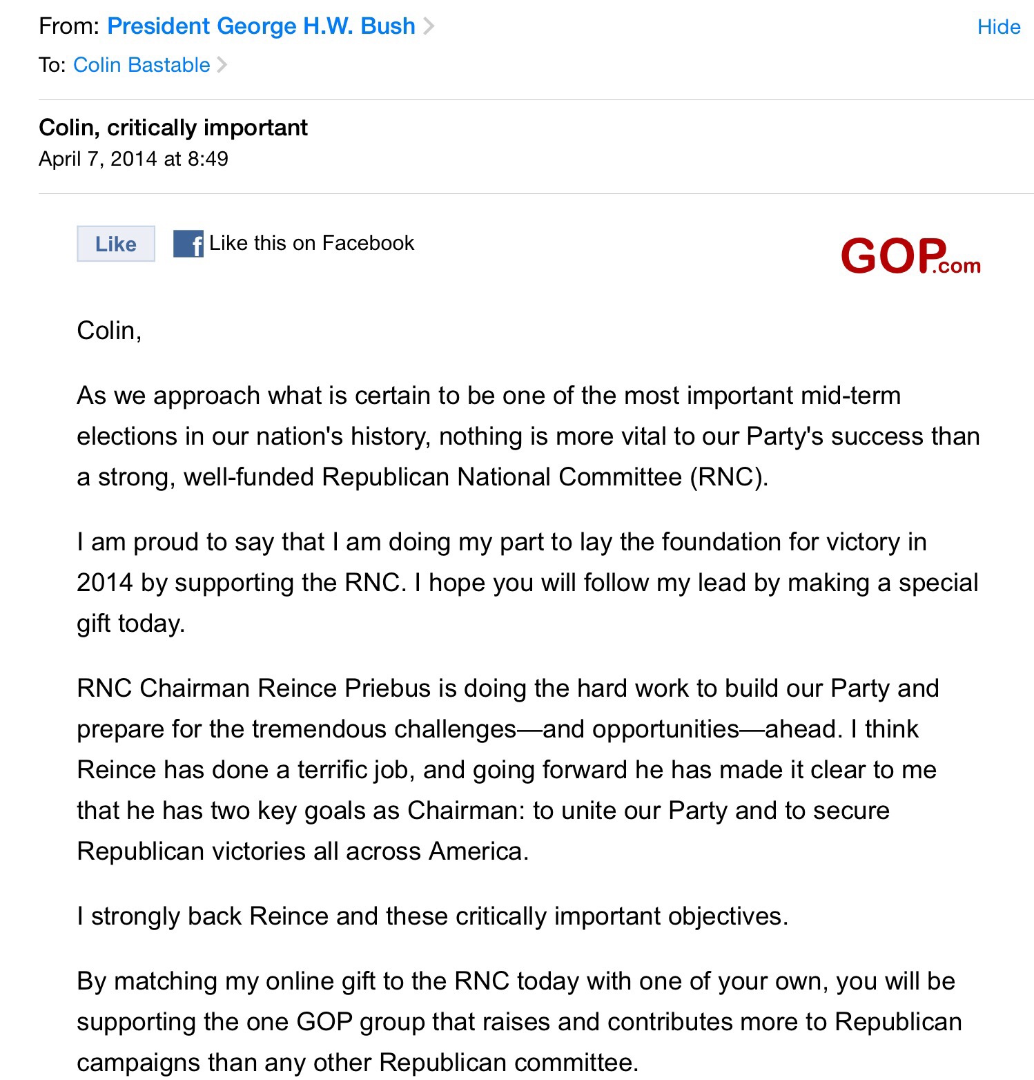 A begging letter from Dubya’s Dad, HW Bush.
