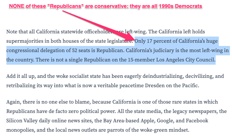 “Only 17 percent of California’s huge congressional delegation of 52 seats is Republican. California’s judiciary is the most left-wing in the country. There is not a single Republican on the 15-member Los Angeles City Council…. California is one of those rare states in which Republicans have de facto zero political power.”
